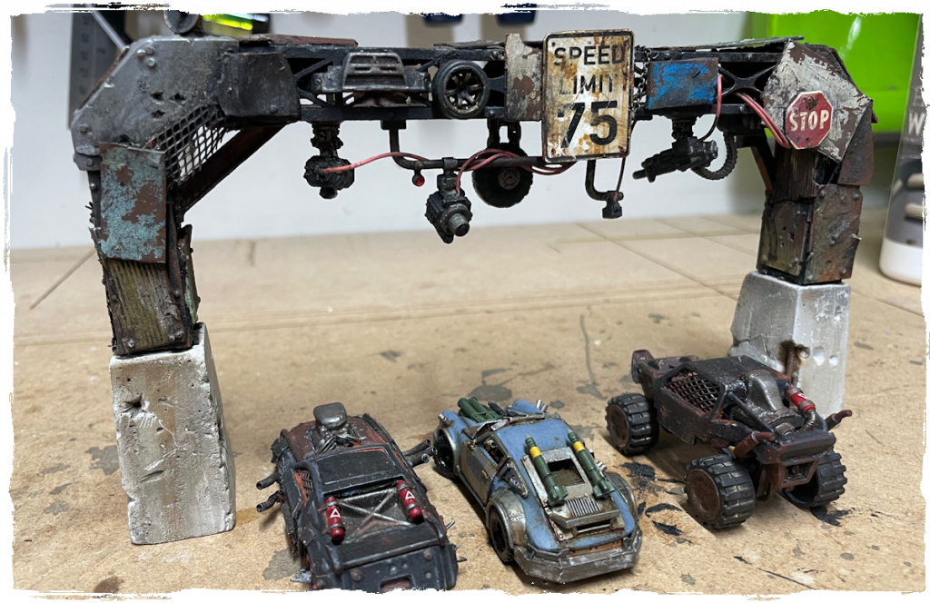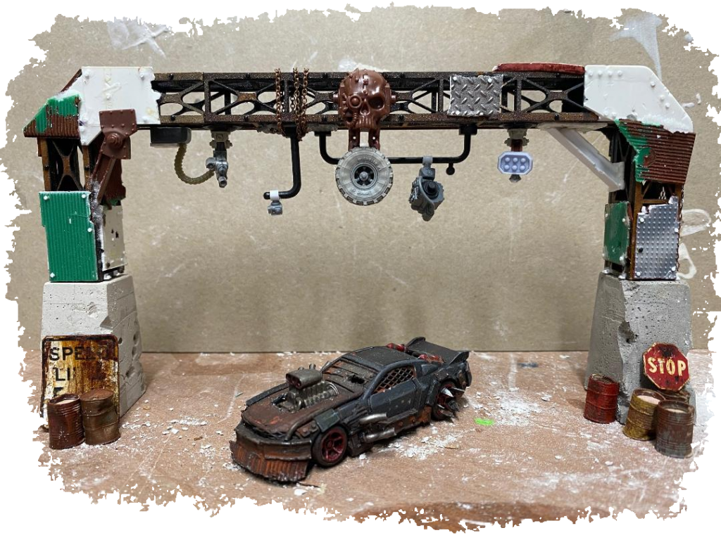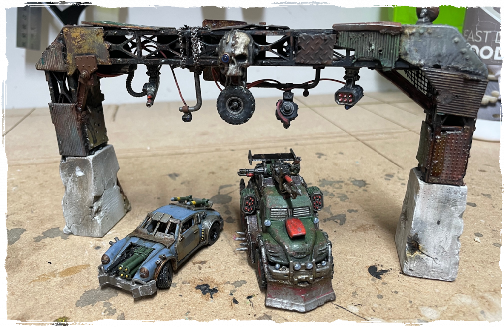 In the last post about this gate, which was well over four and half years ago, I wrote a big list of ideas for how to adorn the gates, and built a basic structure that I started to detail. At some point between then and now, I did a lot more work on it, but didn’t finish it. I recently rediscovered the work in progress gate while setting up for a game of Gaslands with my kids and left it out after the game (which the youngest comfortably won with a performance car) to see if I would get inspired to finish it. And evidently that worked.