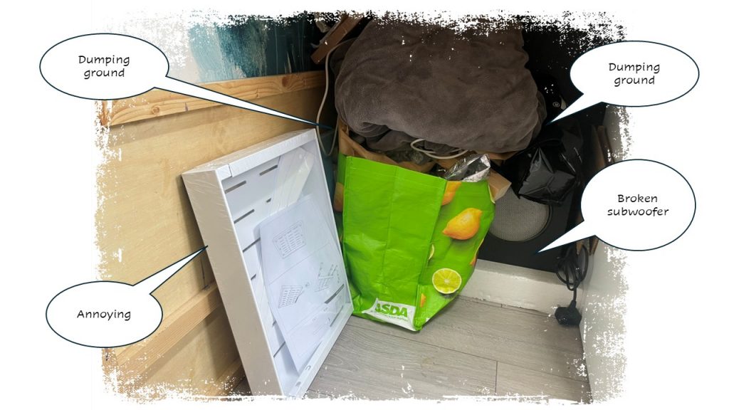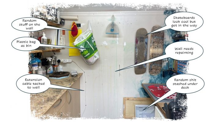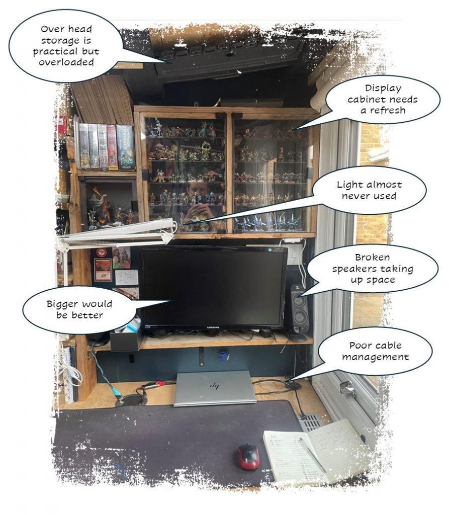 As my thought bubbles make clear, this wall needs clearing and repainting. I’ve had a random carrier bag for rubbish somewhere in the shed for seven years, and there’s no excuse for the range of stuff dumped under the desk – the part of the desk that is supposed to be my hobby area.