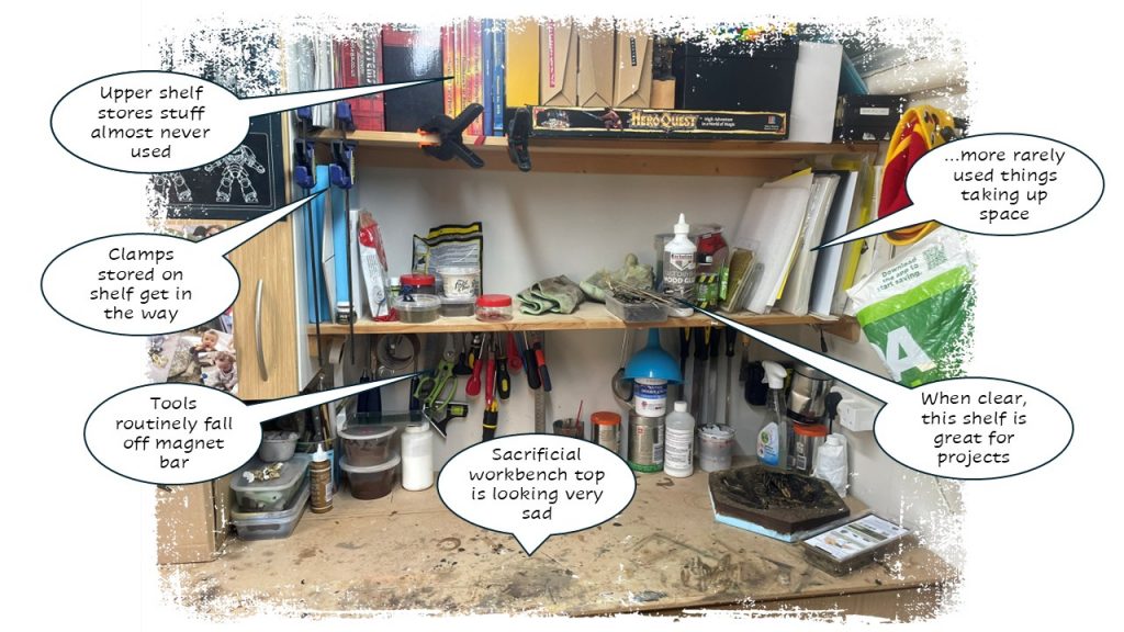 The main thing here though is to get rid of or move a bunch of stuff into the attic or some less used areas of the shed, to free up space for whatever the current project is (here, making my modular trench battlefield) I’ll also need to rethink the tool storage here, as it’s got a bit overcrowded.