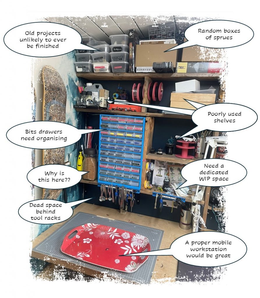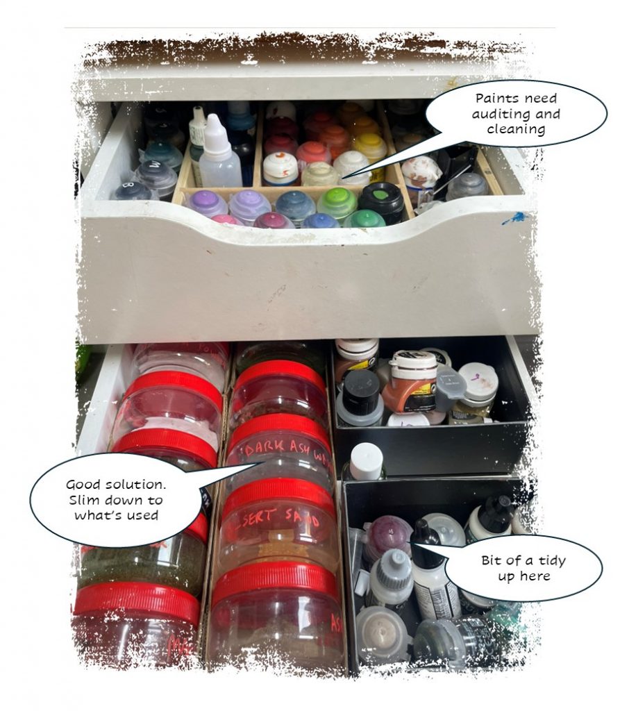 I might get rid of the anglepoise, as have almost never used it – the overhead light is good in the shed, and I’m no pro painter anyway. Besides this, a bit of a cabinet refresh to pinpoint some other stuff from my collection could be nice.
