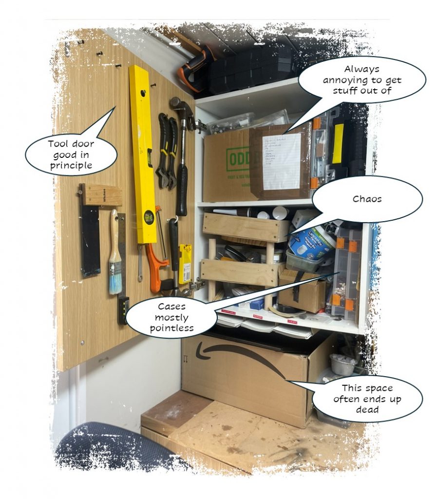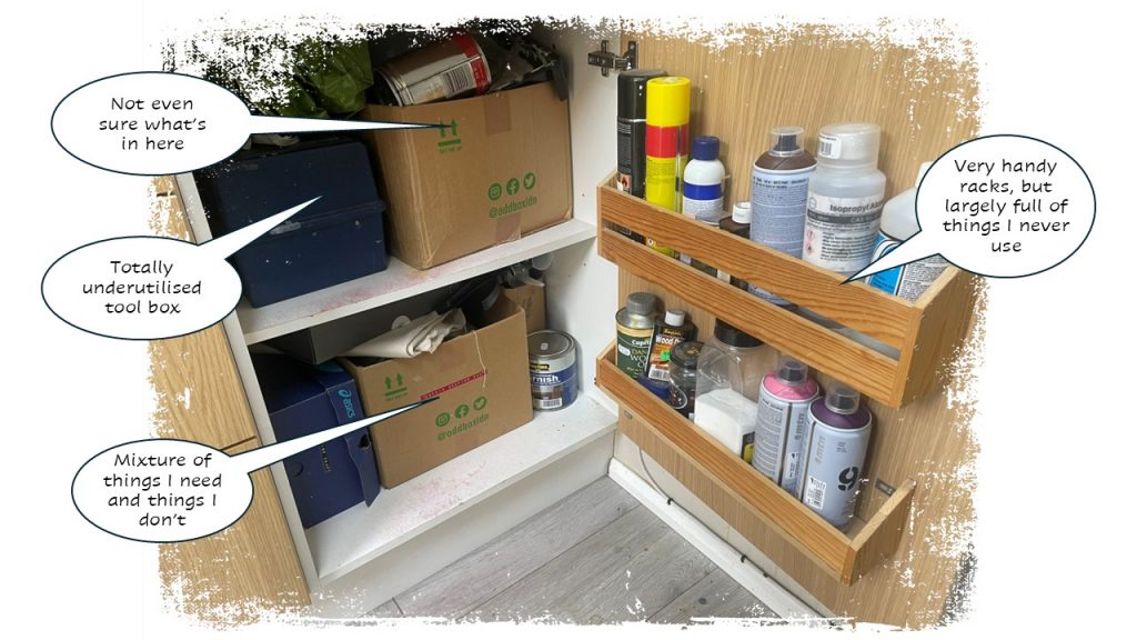 The cupboards under the bench. In this one there are various boxes and I don’t fully know what’s in them anymore. In principle, they’re good for lesser used items, but I think it will be a case of downsizing what I’m storing (a common theme) and make better use of the space that’s there. For example, the racks inside the door here should contain things I need to access a lot, like glue and primer, not things I almost never use like engine degreaser and wood oil.