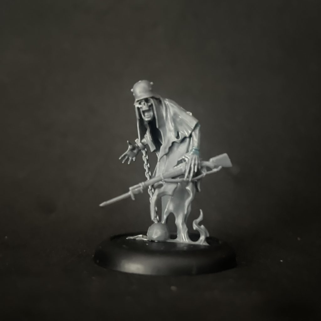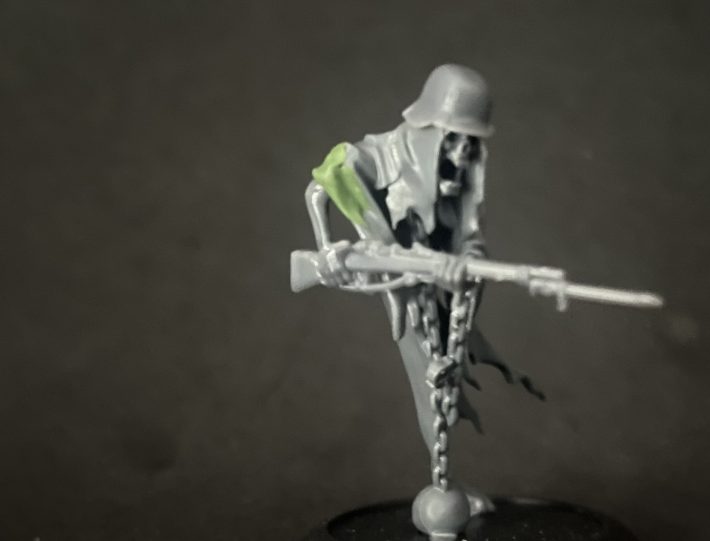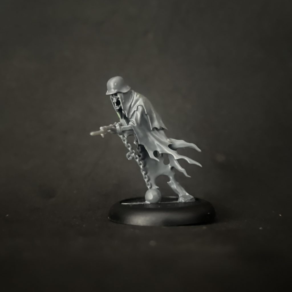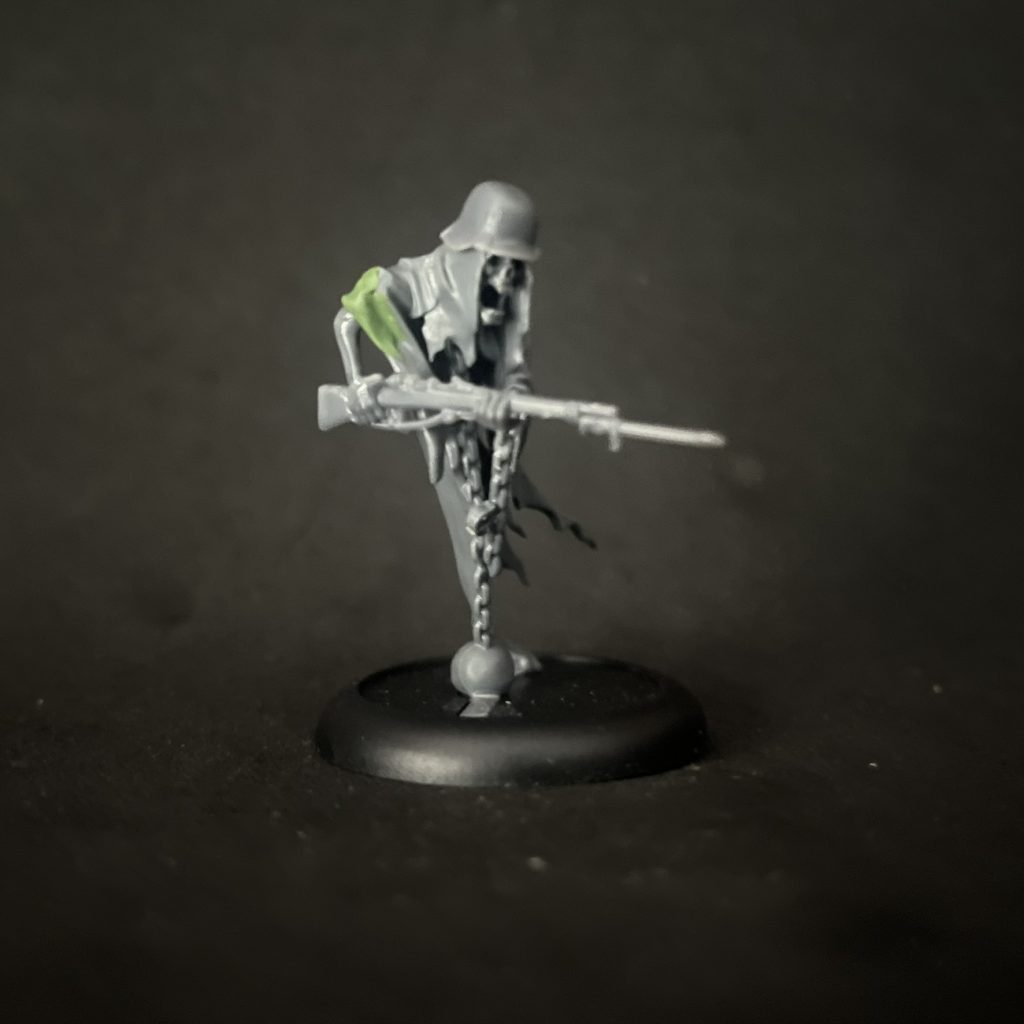 This droog shows the basics of this kitbash – lop off the skull of the Nighthaunt, replace it with a gasmask WW1 helmet, and use one or two of whatever one handed weapon options you can get your hands on (here, a slung rifle), which means you needn’t worry about working out how to get a ghost figure to hold a rifle.